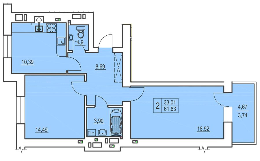Двухкомнатная квартира 61.63 м2
