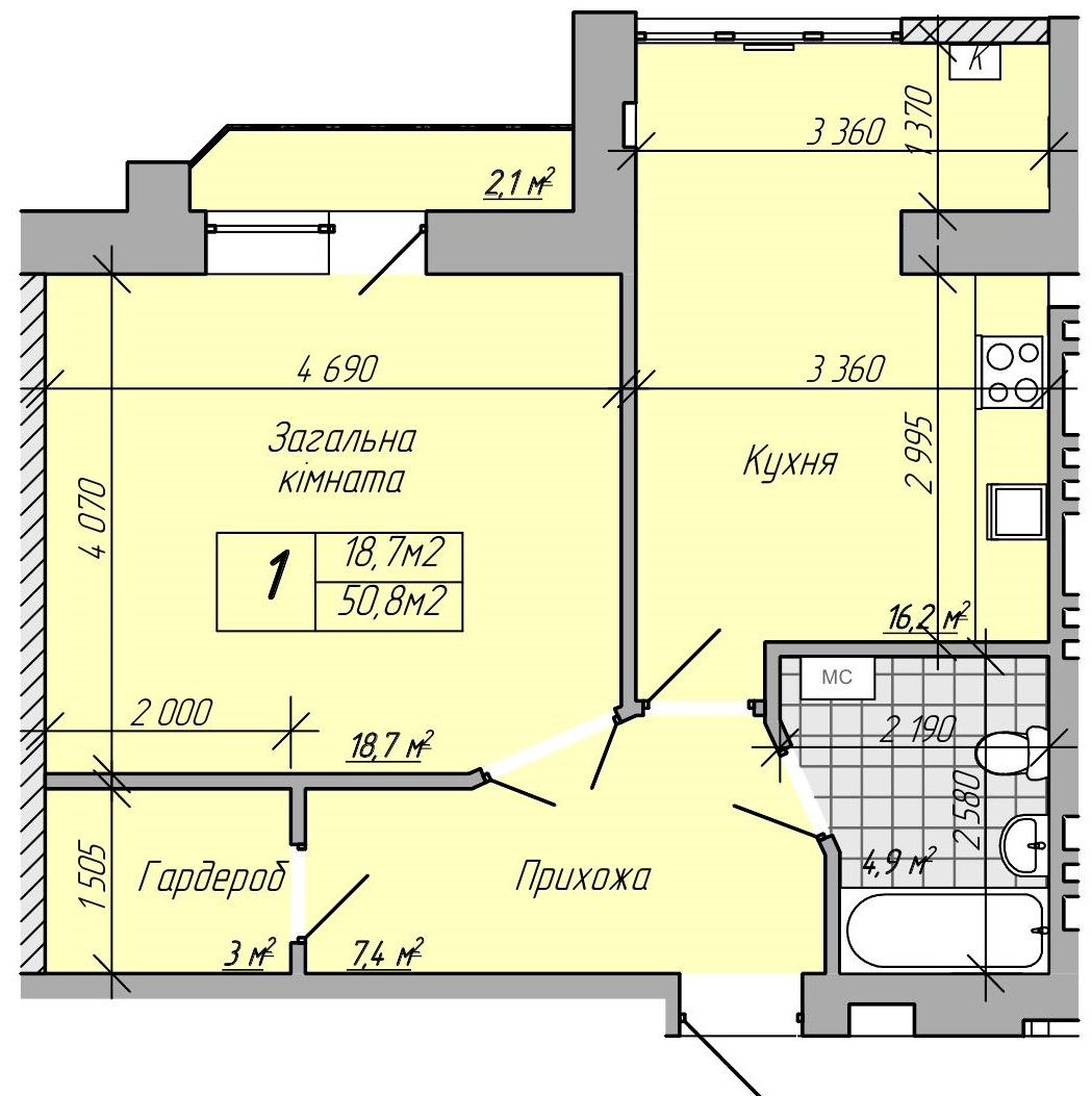 Однокімнатна квартира 50.8 м2
